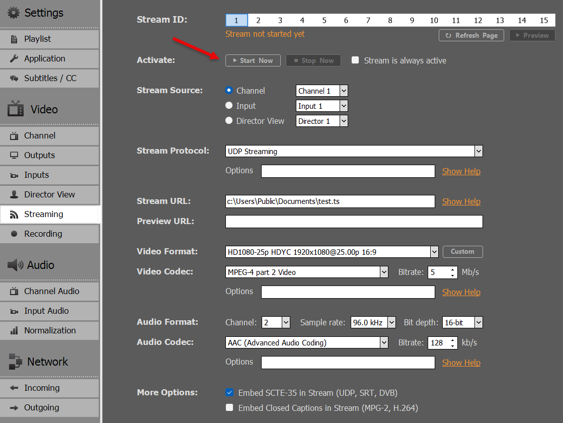 Let’s create a Test UDP Stream, where we simply send the Output to a File, so we don’t have to hassle with Server Stuff (yet). Copy the Settings as follows and start the Stream with START NOW.