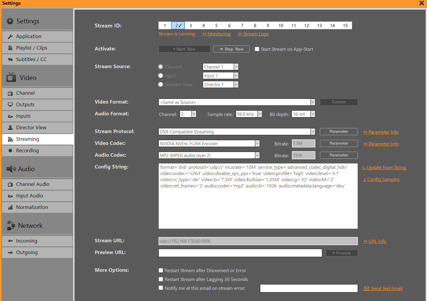 This is strictly speaking not a video feed, as DVS is audio-only. This is yet another Network (LAN) Option. The use case for DVS is, if you need to send your audio feed SEPARATE or ADDITIONAL to your video feeds, or in audio-only productions. The most common use case is, that in live events, the audio mixer needs ALL audio feeds of ALL PLAYDECK channel, meaning: He wants to receive 8 audio channel in stereo pairs of your 4 video channel.