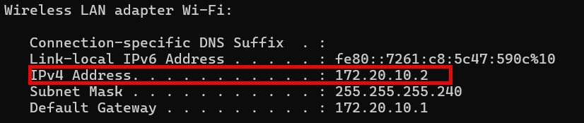 If you want to run a dry test locally without the 2nd line, enable both Ethernet Adapter and Wifi on your PC, then Start a new Hotspot on your Mobile Phone and connect PC Wifi to that Phone. Then open Console (“cmd”) and type “ipconfig”. The IP address you need is there: