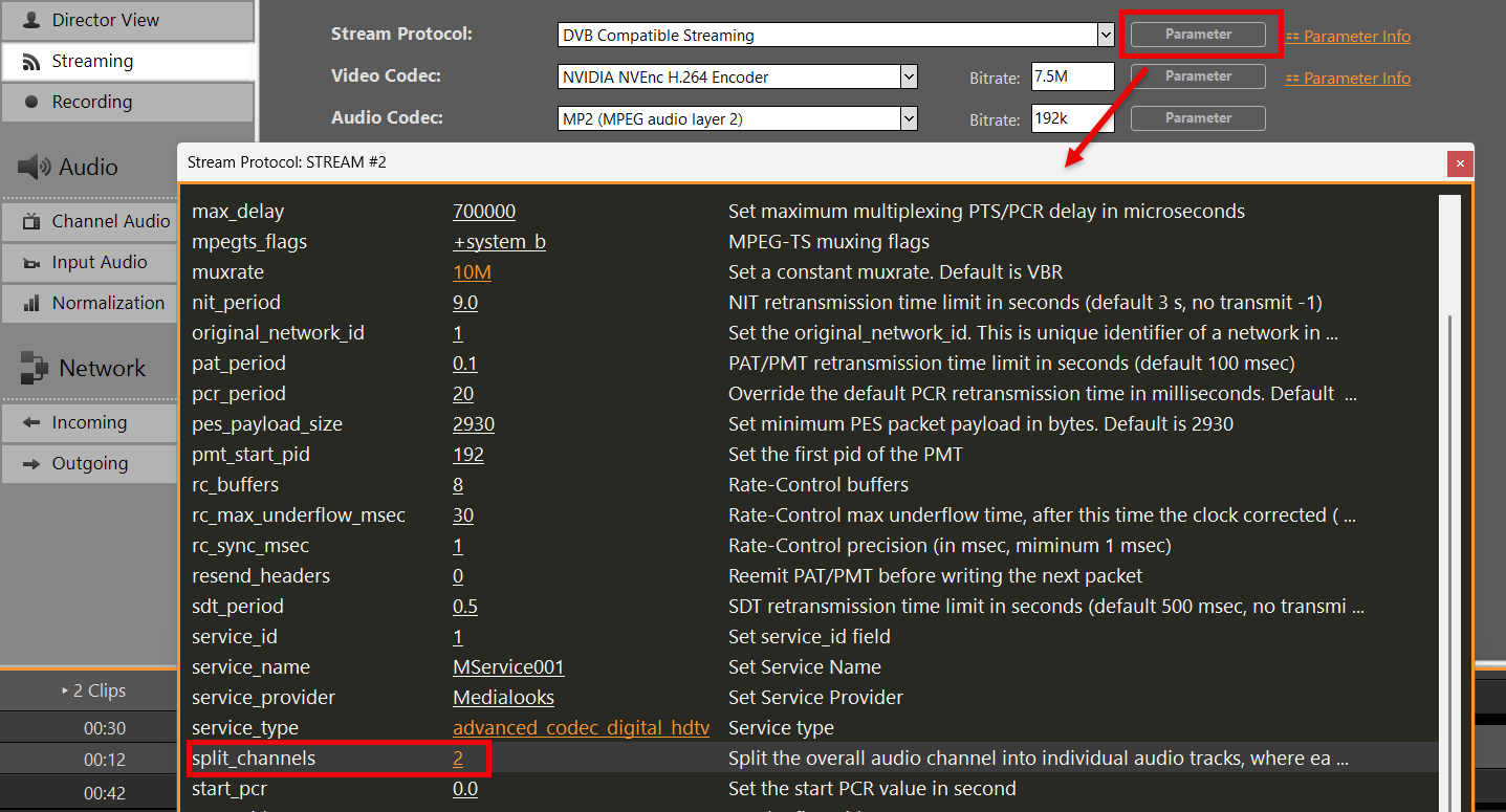Then you open your Stream Settings, especially the Parameter of your Stream Protocol and enable Audio Track Splitting: