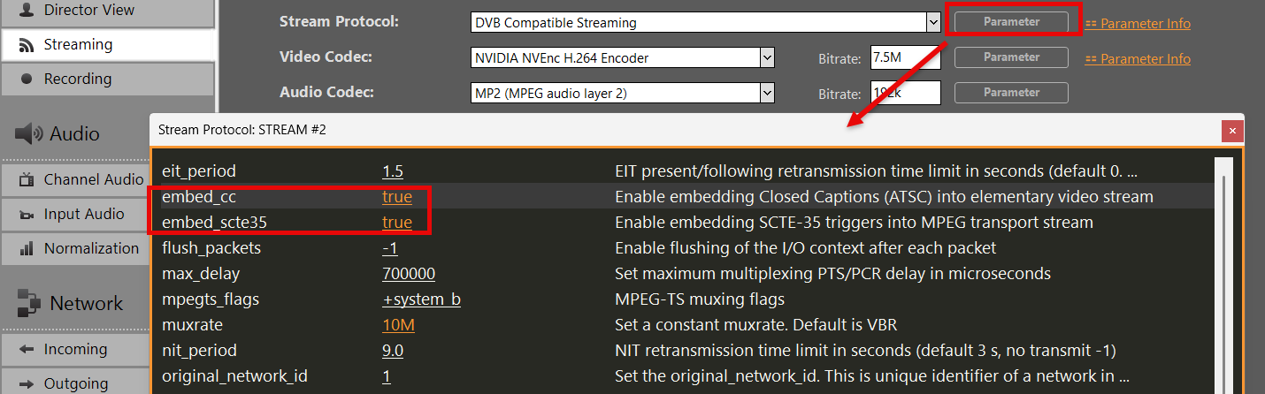INFO: SCTE-35 is only available for Protocols: SRT, DVB, UDP (any Video Codec). Closed Caption will only work with Video Codecs: MPEG-2, H.264 (any Protocol)