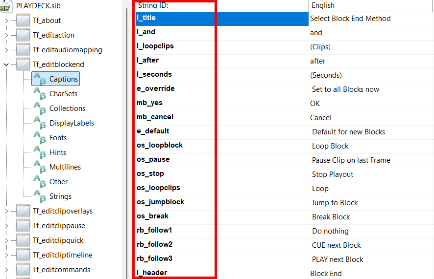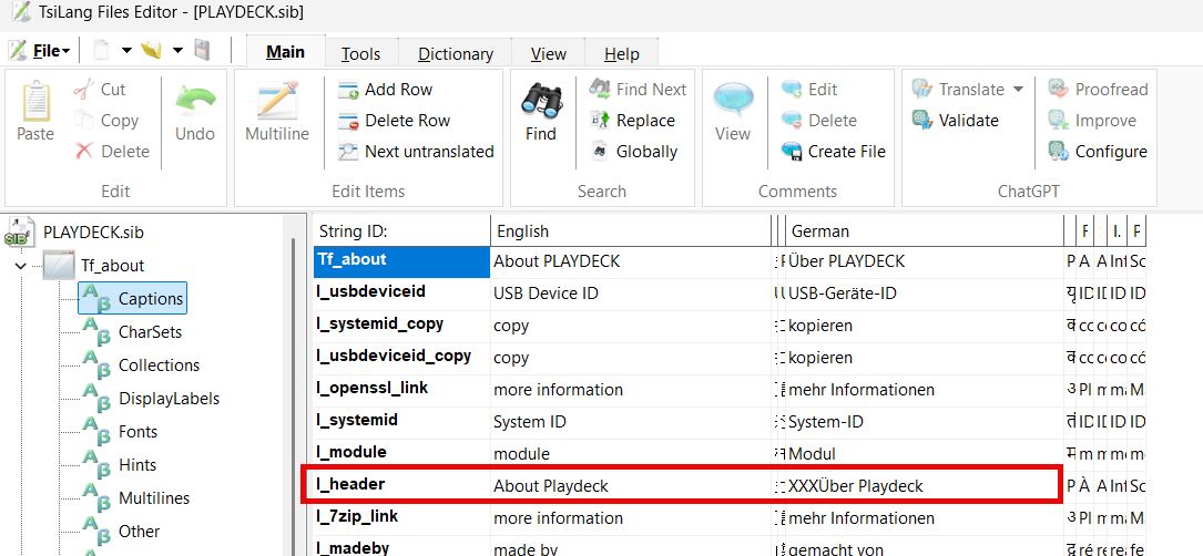 Let’s try to edit something and check, if PLAYDECK updates the translation. Double click the SIB File, which will open the SIL Editor. Open the first branch “Tf_about”, which represents the ABOUT Popup in PLAYDECK. Click on “Captions”, which represents all static text fields in the popup. You can minimize all language columns, that don’t concern you – in this example I focus on GERMAN (can be any other language). Now for “l_header” change the translation to something noticable – in this case I simply add “XXX” infront of the text for testing.