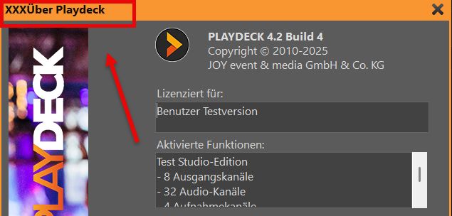 After restarting PLAYDECK, open the About Popup via “License > PLAYDECK”. It now should reflect your text editing change. Don’t forget to change back after testing. Should this not work, please contact us.