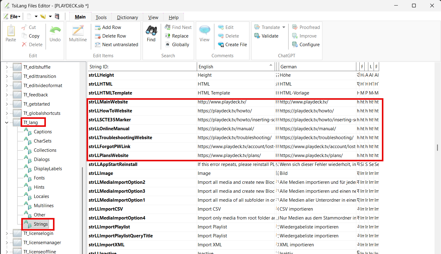 The translations are being edited via an external tool called “SIL Editor”, where you can load and edit our language. You can then preview your edits directly in PLAYDECK.